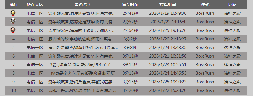 “PVE BossRush每周挑战赛”第一~十名截图